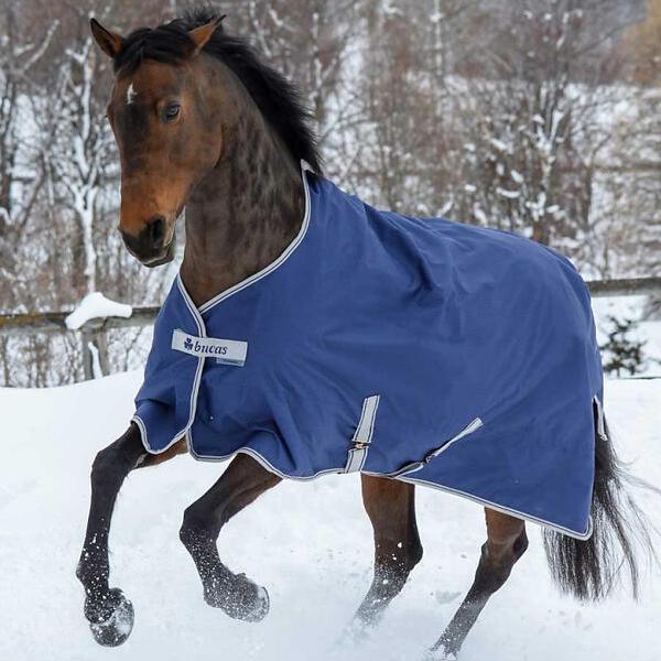 Populært regndekken med fleecefor, 2 kryssgjorter, elastiske beinstropper og haleflapp. Polstring på nakke, bogsplitt samt stillbar i front. Kvalitetsdekken til en rimelig pris. Leveres i svart med marine og hvit kantband.